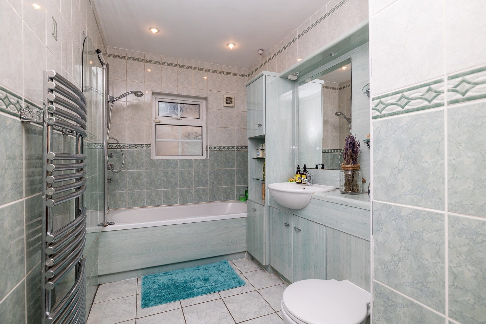 Tiled floors/walls, spotlights, access to attic, shaving spotlights, bath with shower, heated rail, whb, wc, built in cabinets, holders
