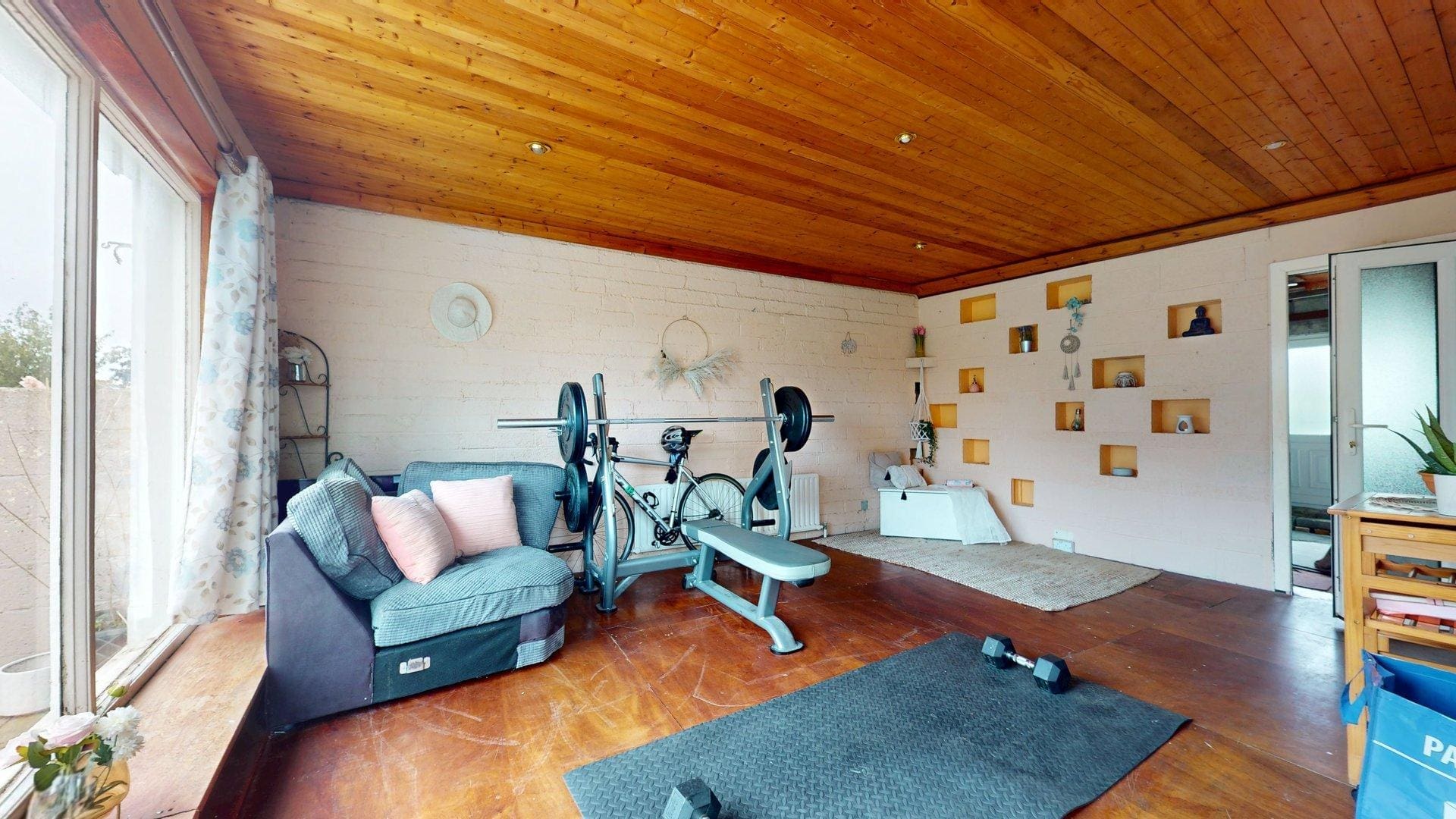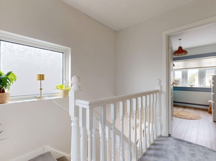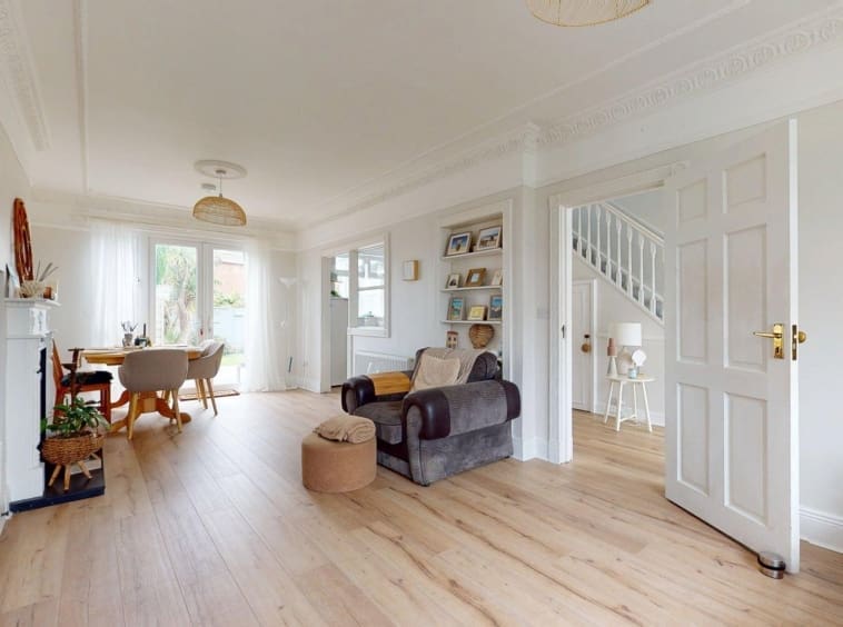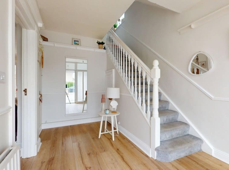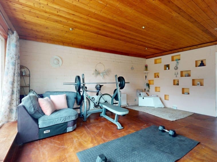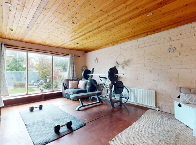 Accommodation comprises an entrance porch leading to a bright, generous hallway. To the front, there is an open-plan family living area which connects through to the dining space and separate kitchen at the rear. The original side garage has been partially converted to a large utility room, with clear potential for adaptation as a fourth bedroom, home office, or playroom. A substantial rear extension currently accommodates a home gym, offering further flexibility for a variety of uses.