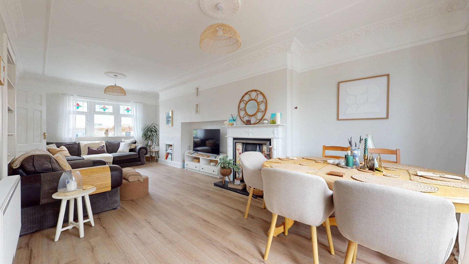 Laminate floors flowing from front to rear, shelved corner areas, open fireplace, sliding patio doors to rear.