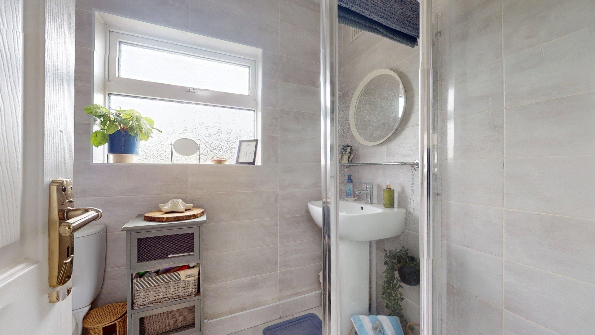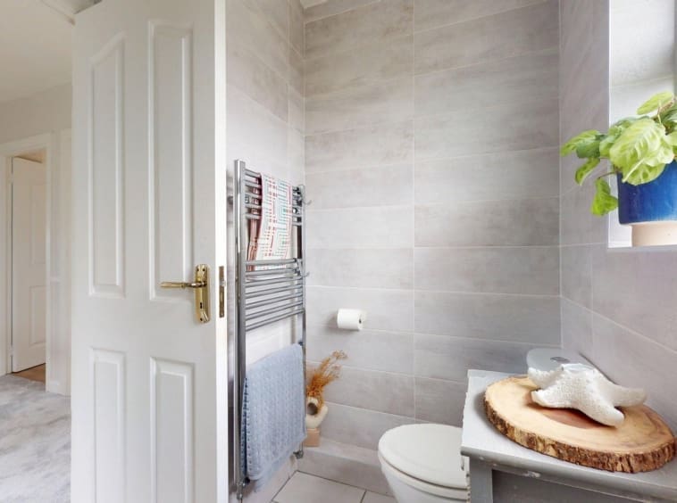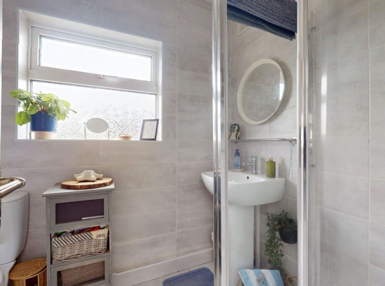 Tiled walls and floors, WC, WHB, cubicle corner shower, heated towel rail