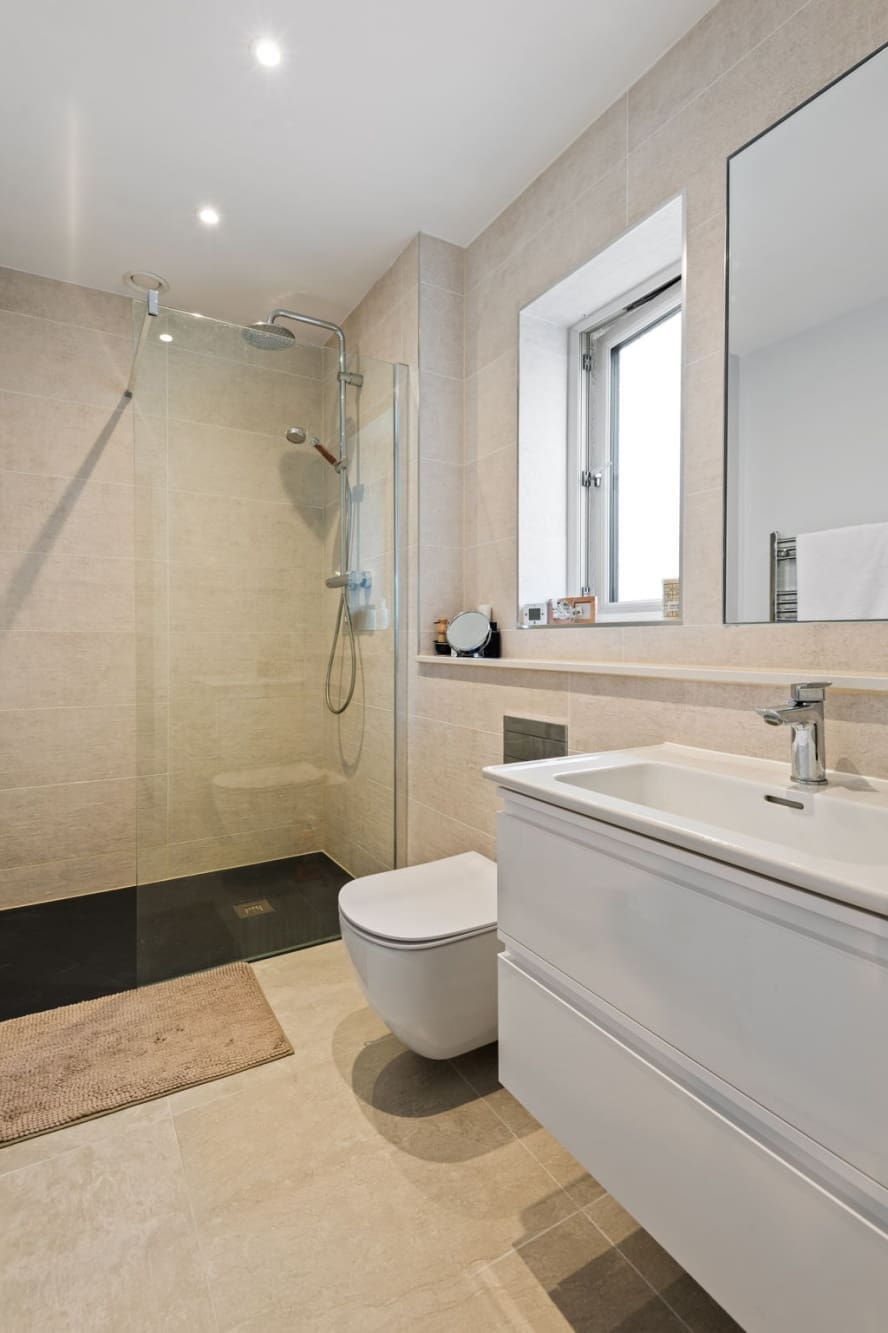 Tiled floor, walk in shower with rainfall shower head & handheld shower head, WC ,WHB, heated rail, mirrored cabinet