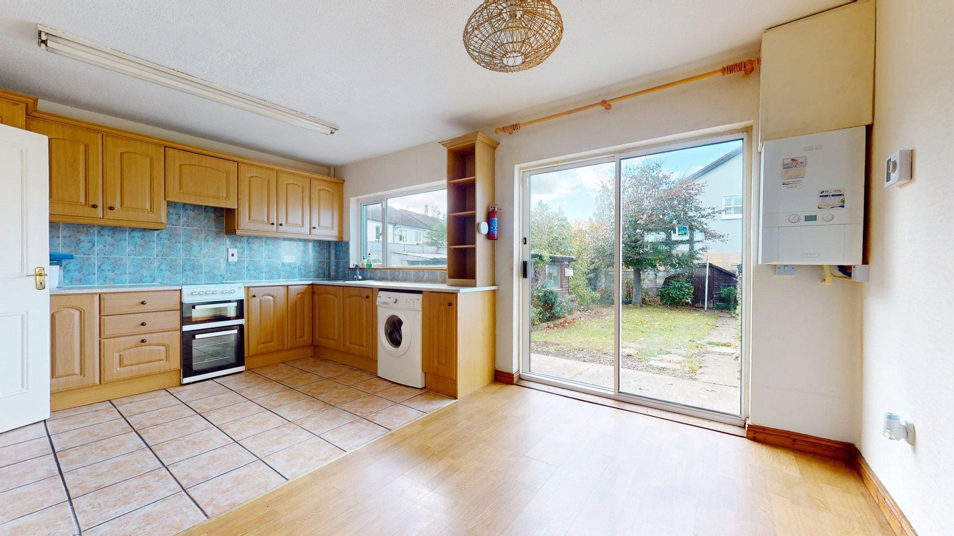 Laminate floors in dining space with tiled floors and splashbacks in kitchen space. Contemporary style kitchen with a range of floor and wall mounted presses. Washer dryer, electric oven and hob with extractor over, fridge freezer. Sliding patio doors to sunny west facing rear garden, not directly overlooked.