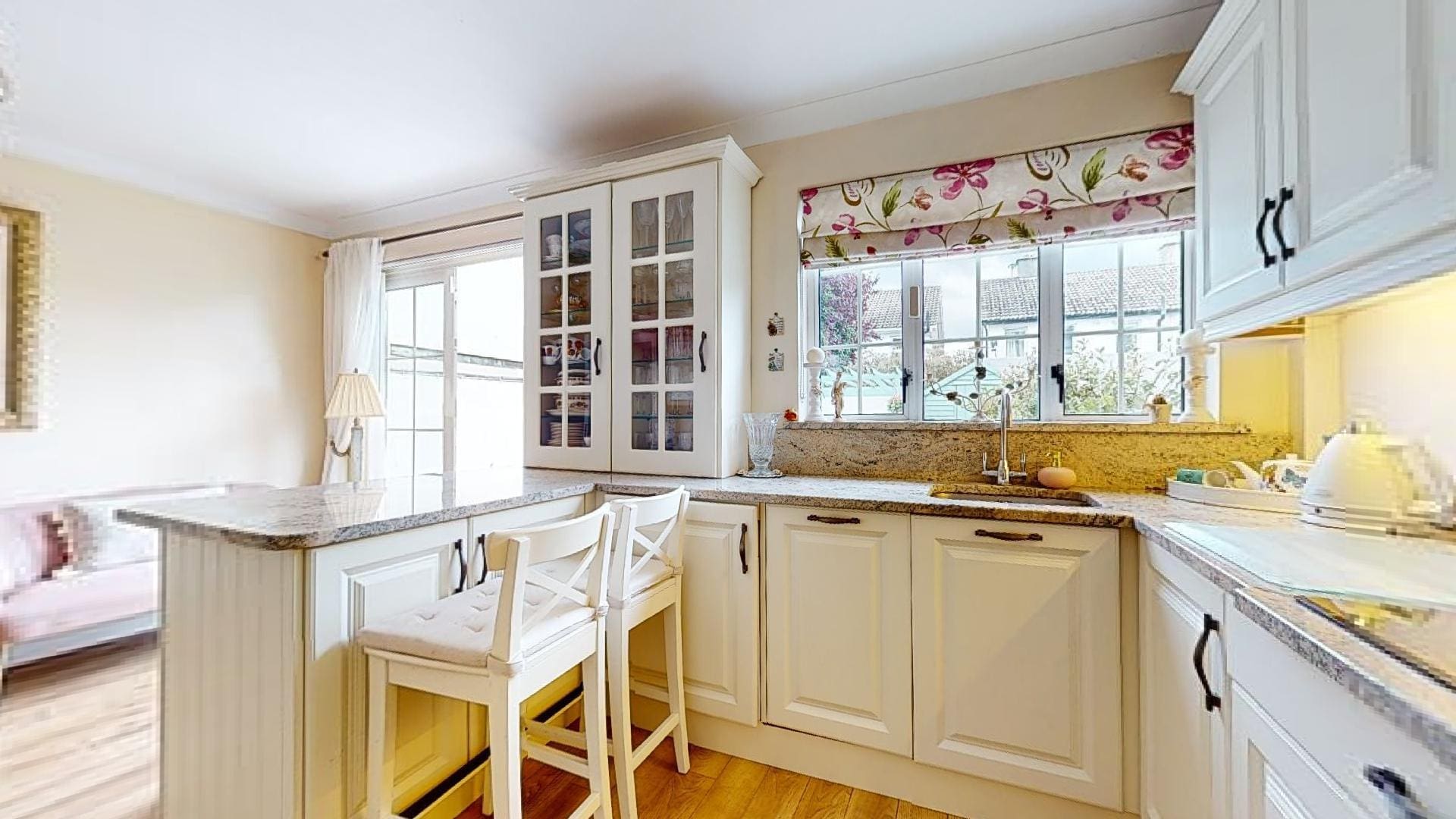 Semi-solid oak floors. Fitted kitchen with centre island unit, granite worktops and splashbacks. Integrated Nordmende oven/grill/microwave, induction hob with extractor unit over, fridge freezer, dishwasher, washer dryer.
