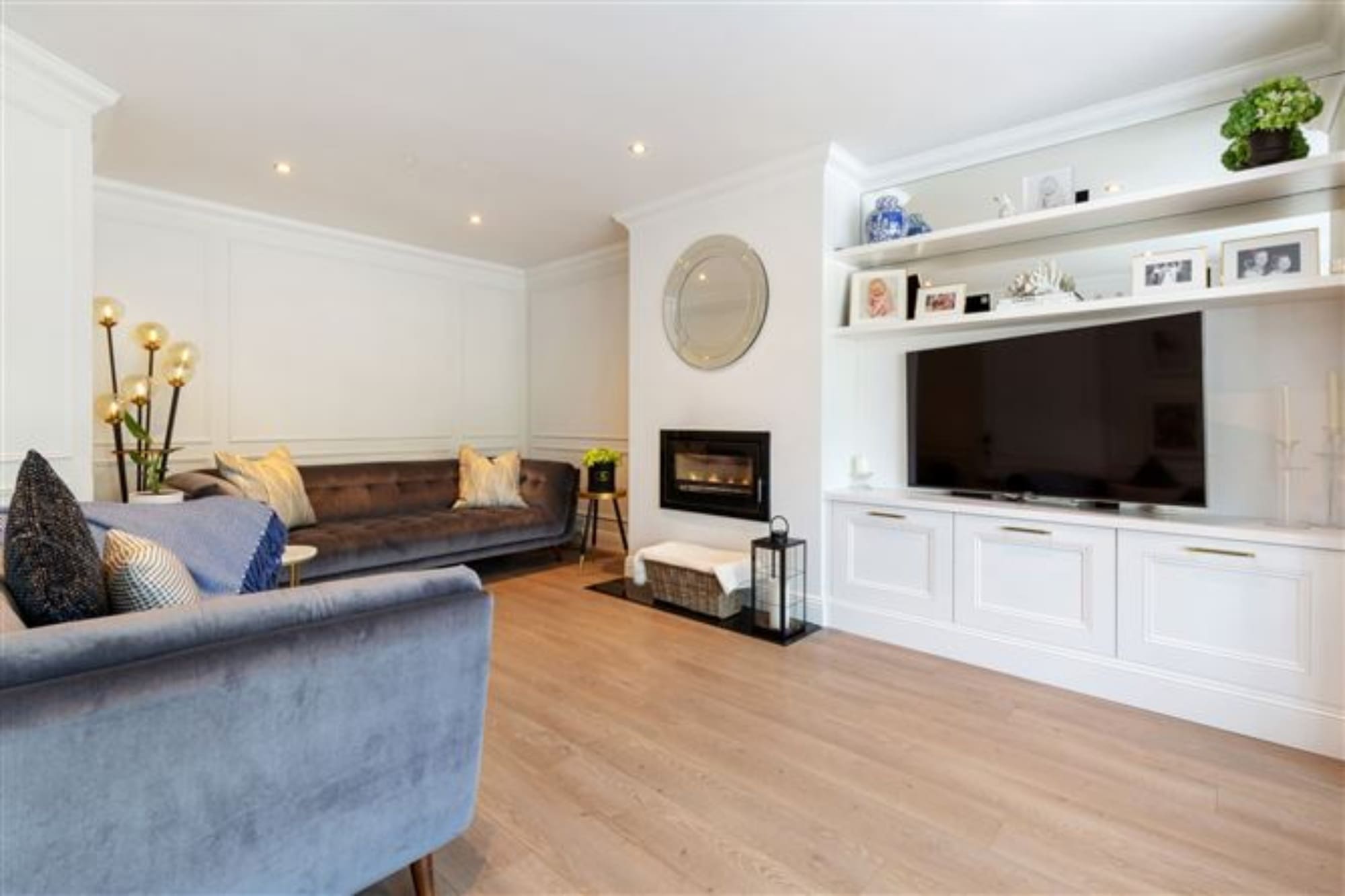 Decorative timber floor, recess lights, feature stove fire, shutter blinds, built in unit, panelling, coving