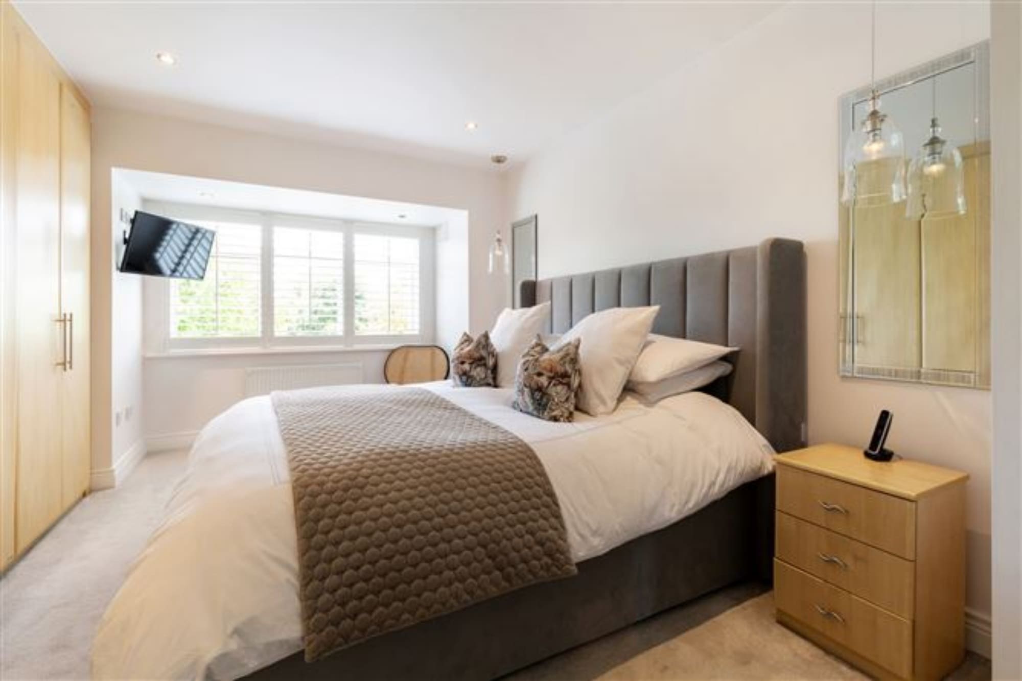 Carpet floor, fitted wardrobe, recess lights, shutter blinds