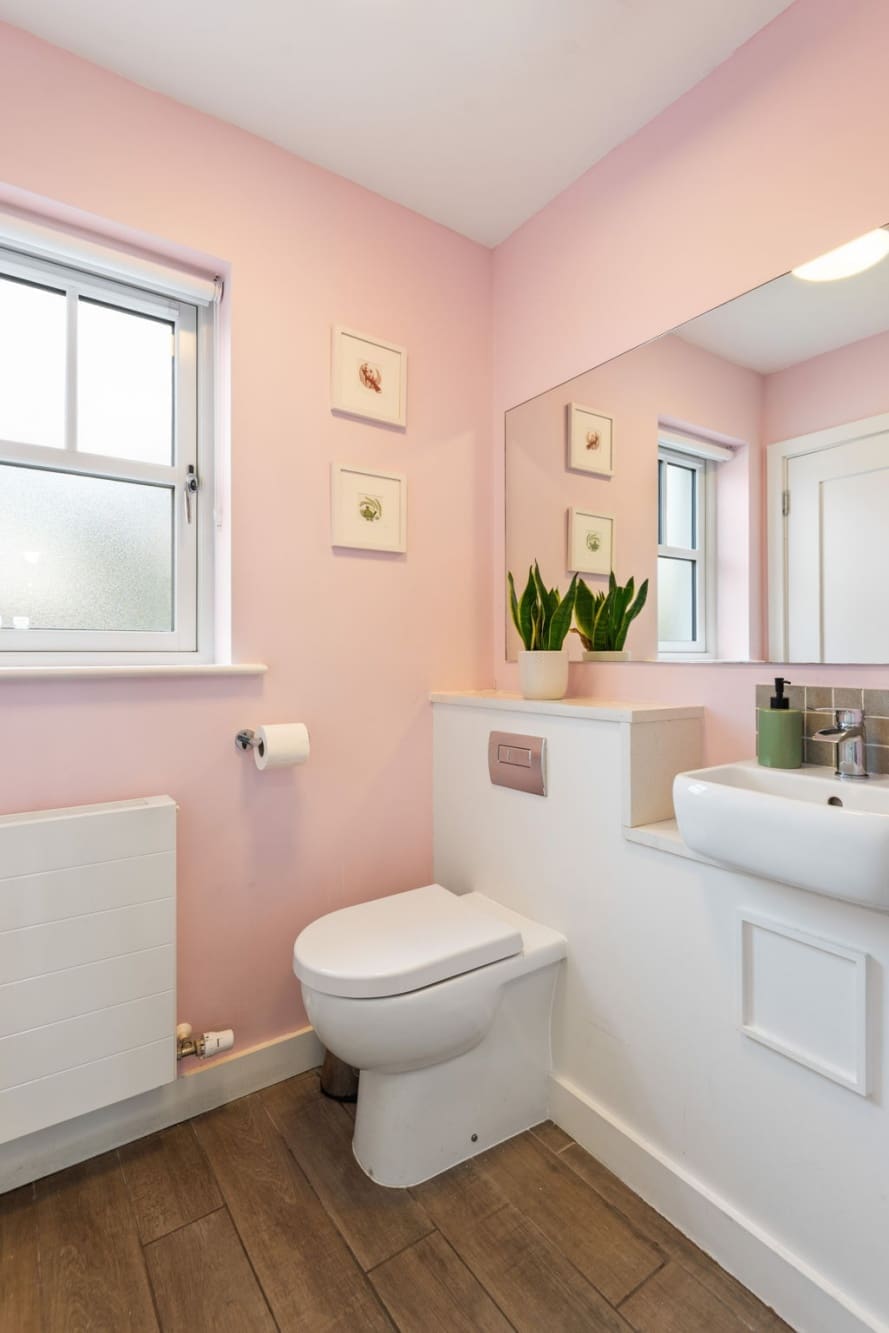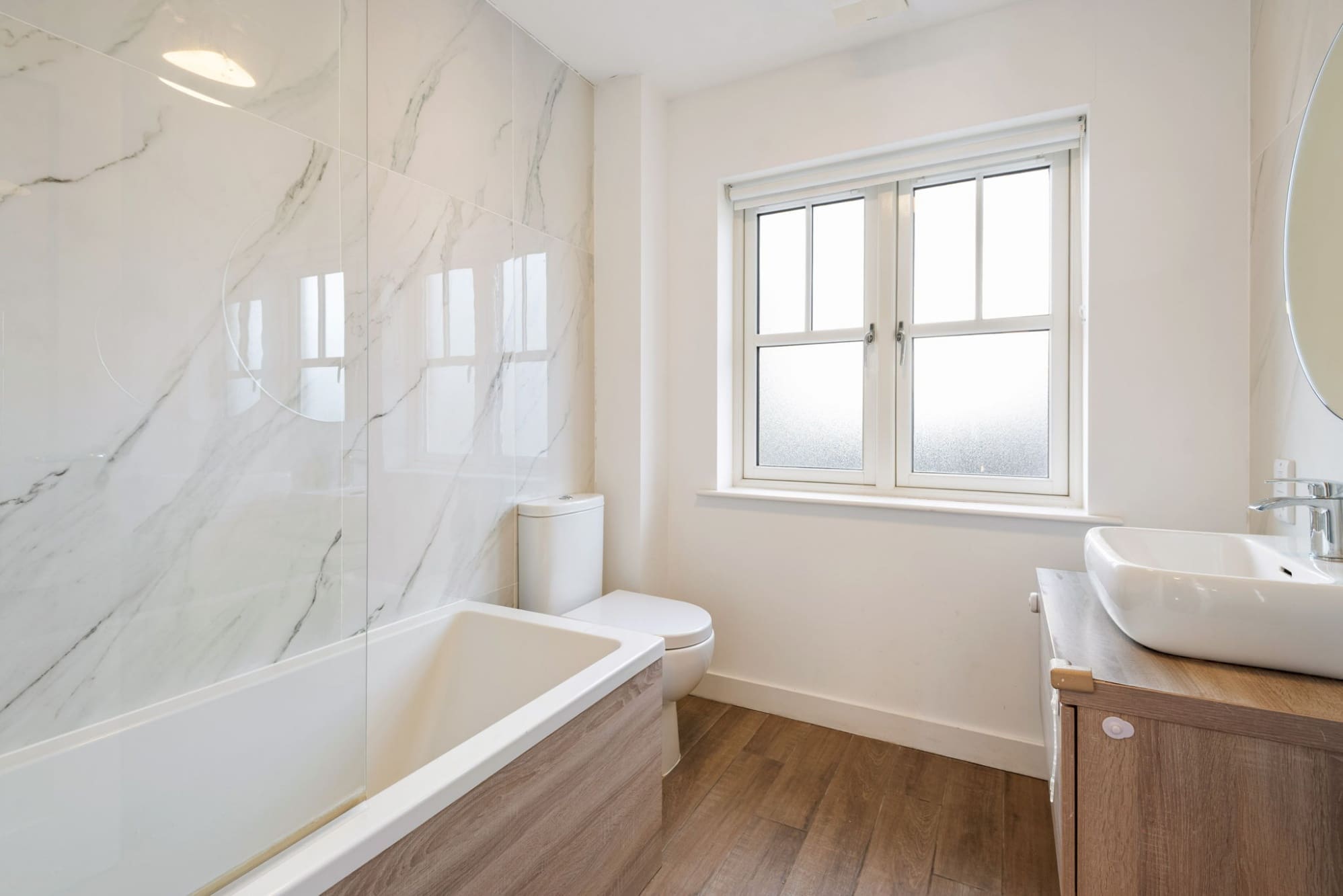Fitted storage, heated rail, w.c., w.h.b., bath and screen, waterfall shower