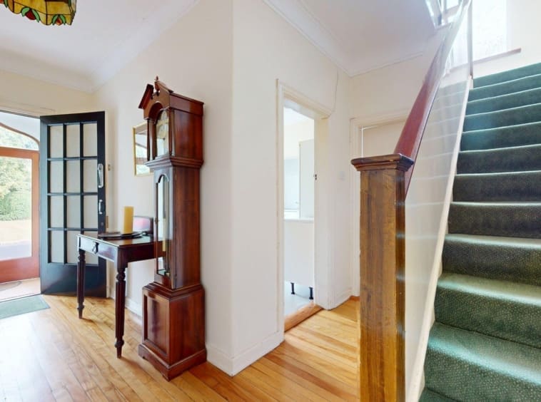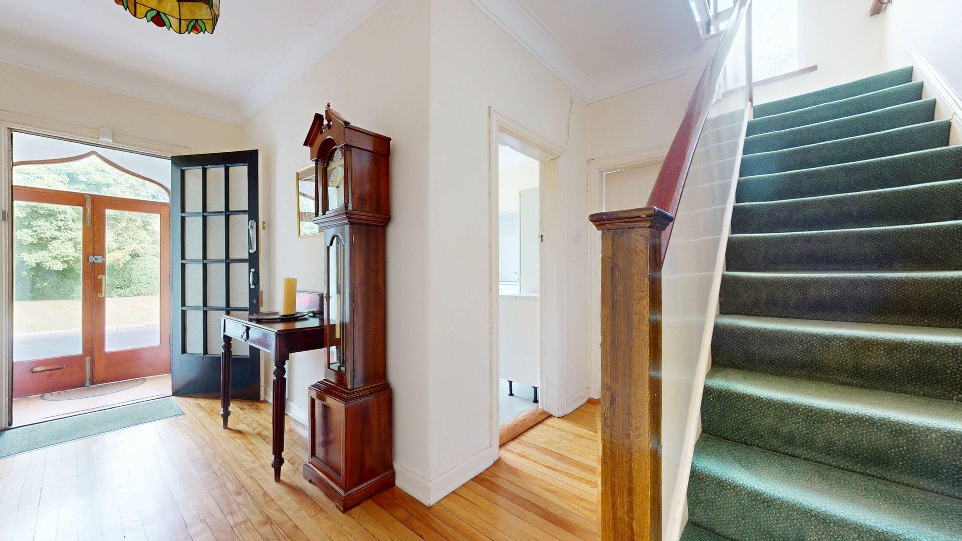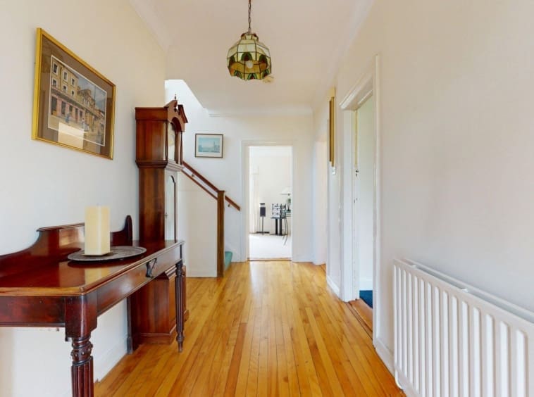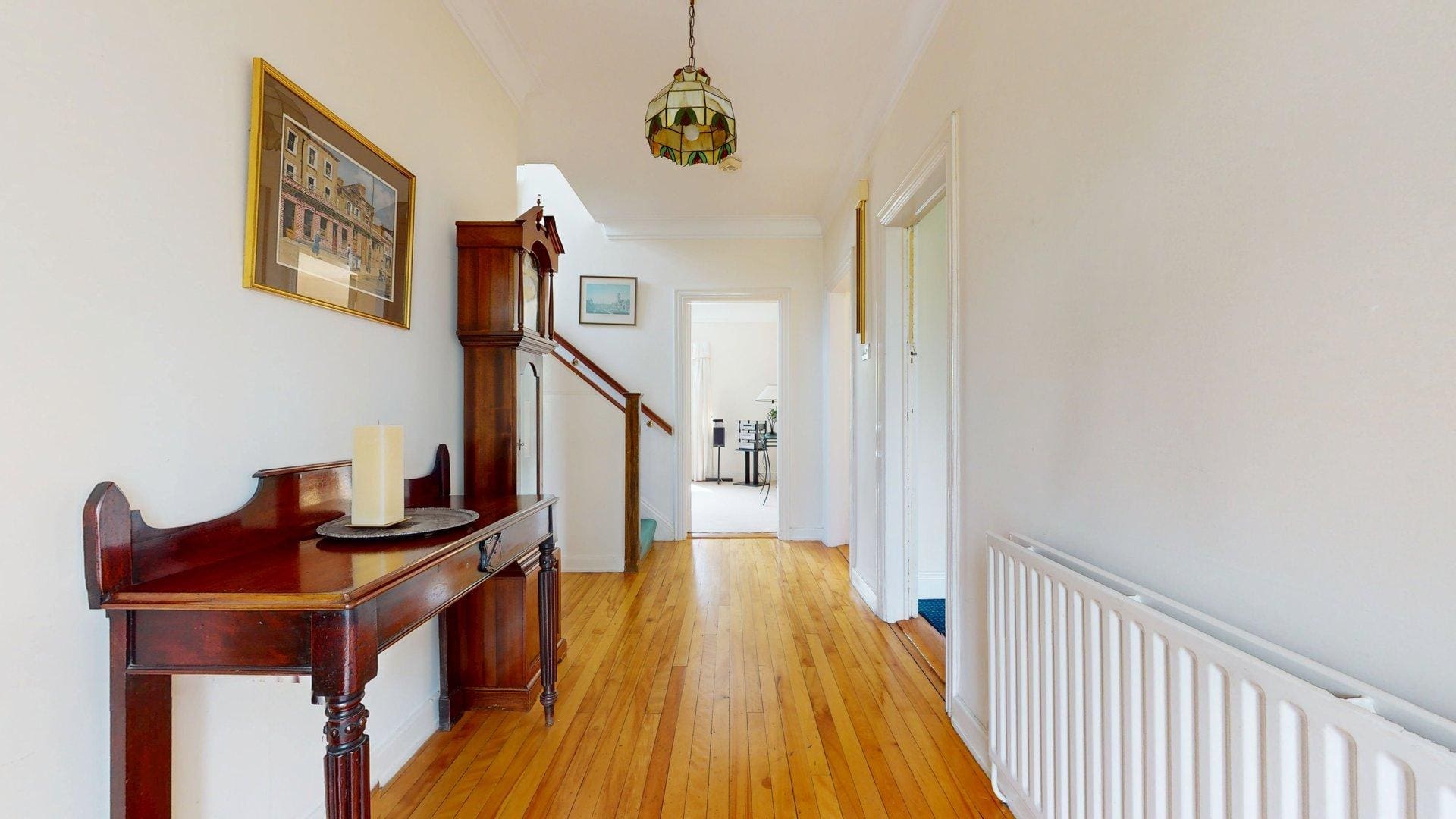 Graceful entrance hallway with high ceilings and attractive ceiling coving.