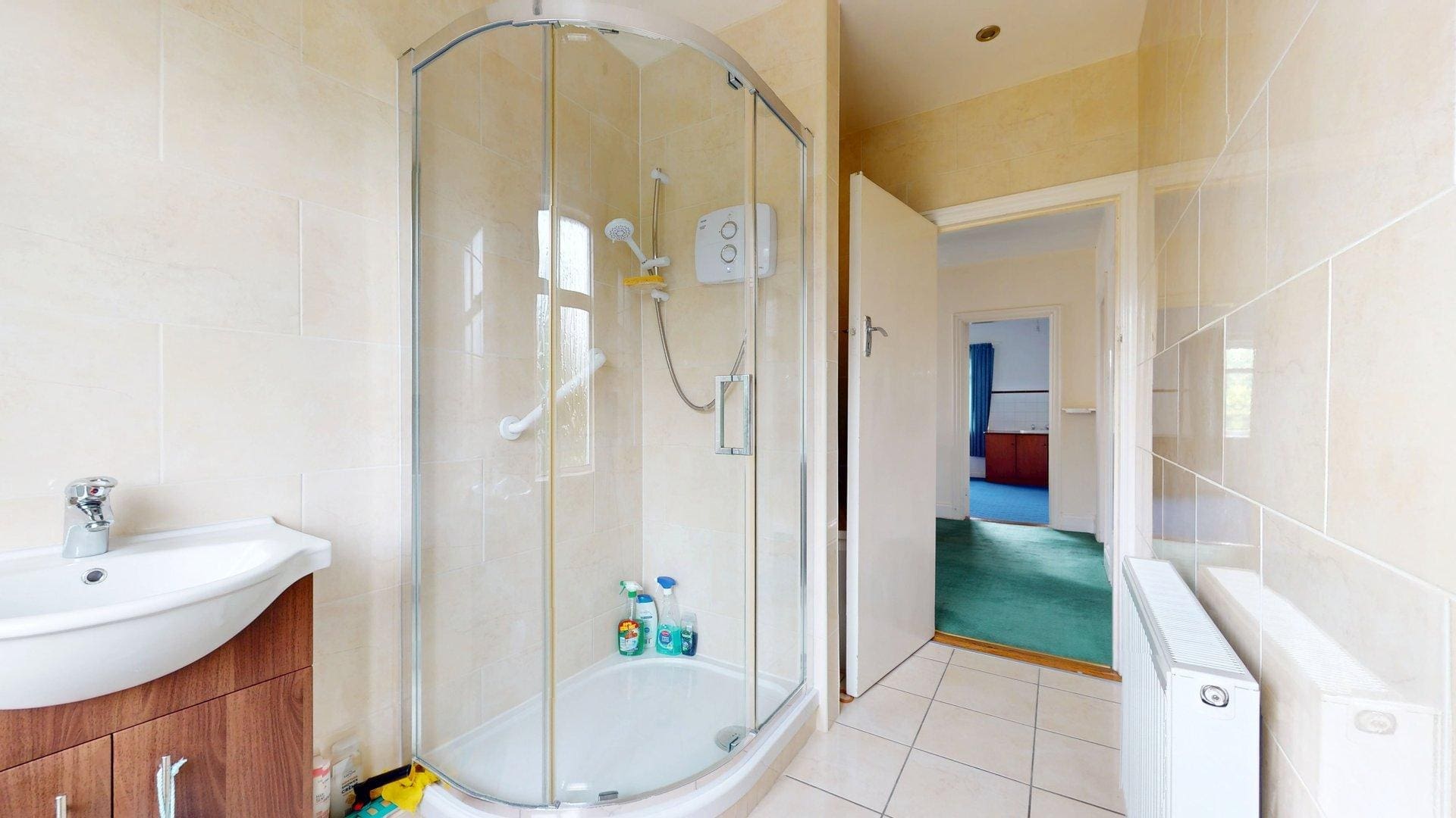 Contemporary style bathroom with cubicle shower and vanity unit with sink over.